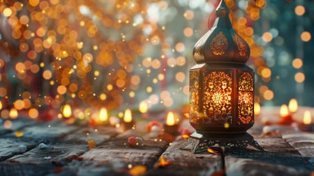 Arabic lantern glowing on a table with enchanting magical blurred background setting