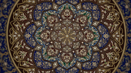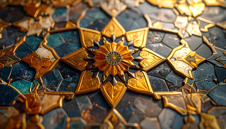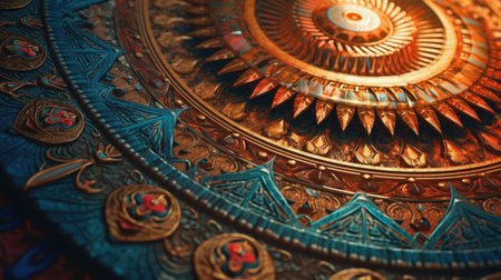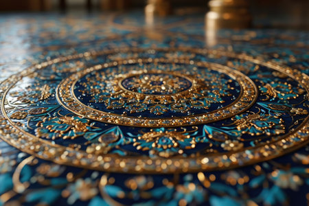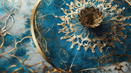 Detailed decorative pattern with gold and blue hues, highlighting intricate craftsmanship and artistic design, perfect for cultural themes and visual storytelling