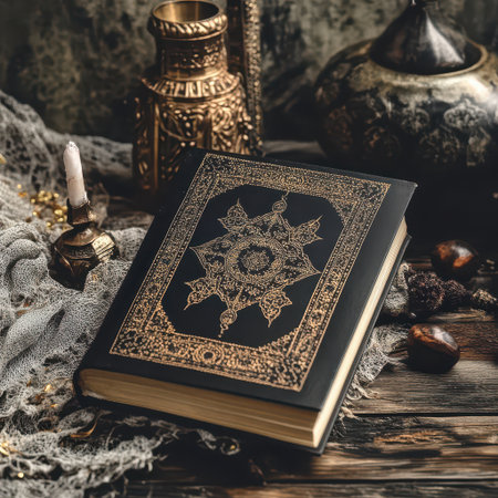 A decorative book with intricate designs rests on a wooden table paired with candles and vintage decor for a cozy vibe.