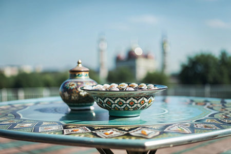 Decorative Islamic art pieces on marble, floral background