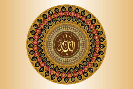 Asmaul Husna, Beautiful names of Merciful Allah. Means, God. Allah is the name of God in Islam. Golden vector calligraphy. Suitable for print, placement on poster and web sites for Islamic education.