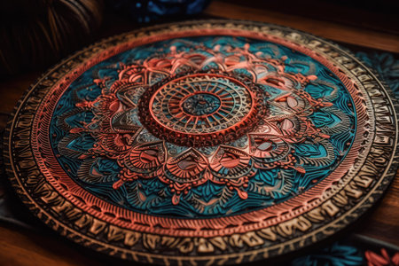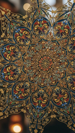 Colors showing elaborate circular mandala with rich blue red and gold colors detailed floral and paisley motifs with pearl accents and a blurred background...