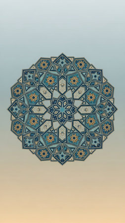 Gradient showing a circular islamic geometric mandala in shades of blue, teal, gold, and white, set against a soft, subtle gradient background of pale blue and...