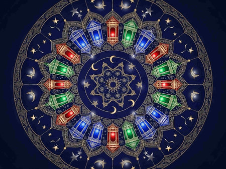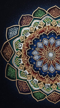 Dark showing detailed islamic calligraphy mandala with vibrant red green blue and gold colors and intricate patterns on a dark background keywords: islamic,...