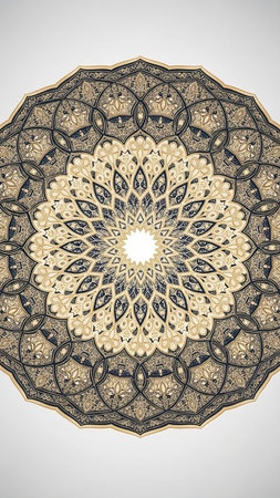 Geometric showing elaborate circular mandala with intricate floral and geometric patterns in deep teal gold and cream hues with a subtle faded mandala overlay....