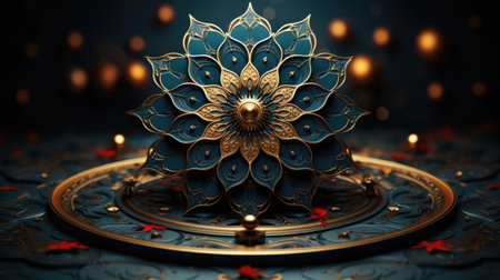 3d illustration of a decorative plate with gold ornament on blue background