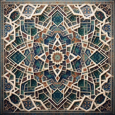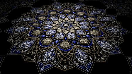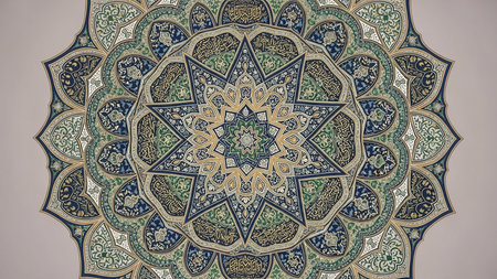 An elaborate Islamic geometric pattern on a ceiling, featuring intricate star designs with floral elements in blue, yellow, and green.