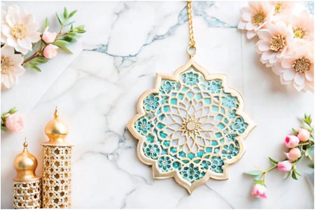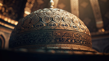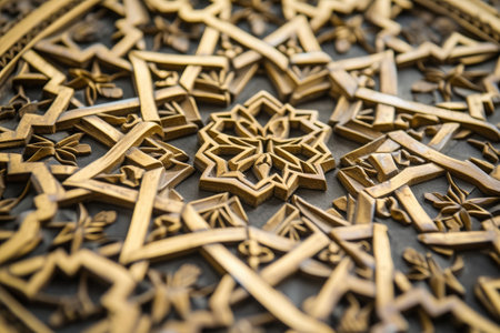 This photo showcases a close-up view of a gold plate adorned with crosses, emphasizing the intricate details and craftsmanship, Intricate details of an Islamic geometric pattern, AI Generated