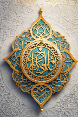 An elaborate Islamic geometric mandala featuring intricate patterns and Arabic calligraphy in shades of blue, green, gold, and cream.