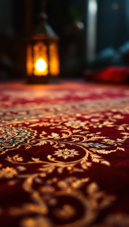 Elegant red carpet with ornate gold embroidery in soft lantern light.