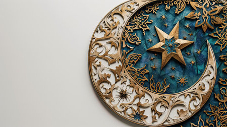 Golden crescent moon resting on an ornate Turkish patterned surface, with geometric arabesque and floral motifs, perfect for Eid decorations.
