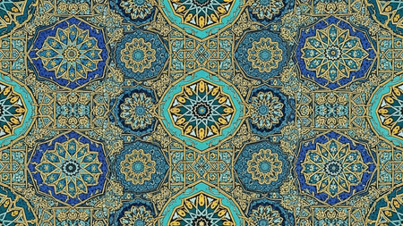 Golden showing intricate and vibrant geometric mosaic pattern featuring interlocking star shapes and floral motifs in rich shades of deep blue teal and golden...