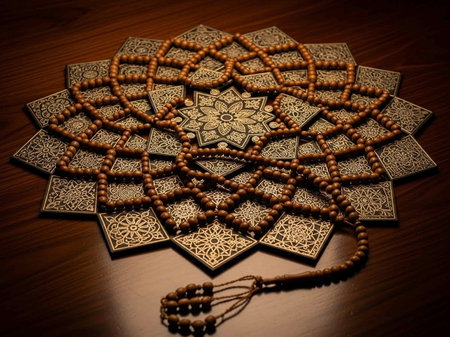 Traditional wooden prayer beads (tasbih) intricately arranged on a dark wooden table, surrounded by decorative tiles featuring elegant Islamic geometric patterns, creating a serene and contemplative atmosphere.