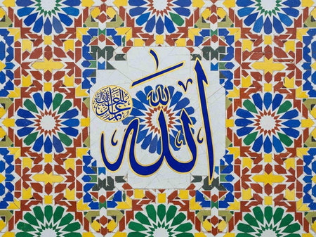 Colorful Moroccan tiles with Arabic calligraphy on the wall.
