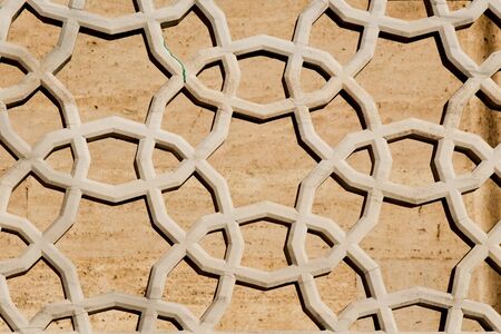 Islamic geometry pattern made from metals and ground fiber reinforcement concrete used as building facade as wall decoration.