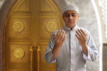 Asian Muslim man standing while raised hands and praying on the mosque