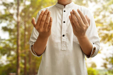 muslim man keep hand in praying gestures during ramadan, Close up