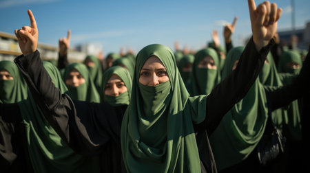 Muslim women in traditional green clothes in rally protest during a religious celebration. Israel and Palestine war concept.