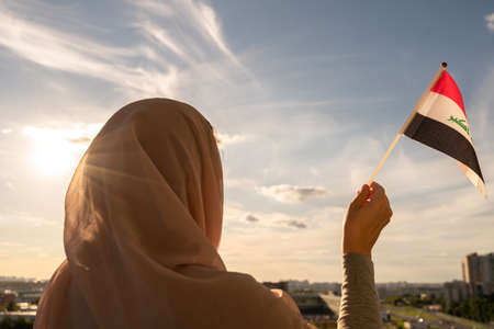 Silhouette of muslim woman in head scarf with Iraq flag at blue sunset sky. Concept of freedom