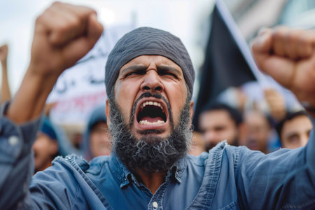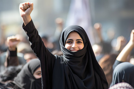 Muslim woman in black hijab protesting on the street