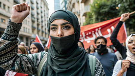 Pro Palestine manifestation held in Milan 2014. People took to the streets to claim Gaza and Palestine freedom against israel war and bombing, Arab woman protesting at a social rally, AI Generated