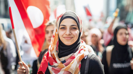 Portrait of a young woman wearing a hijab and smiling during a protest, holding a flag