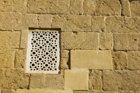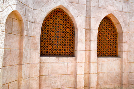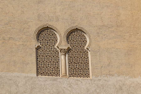 beautiful original islamic antique window with spanish fortress architecture background