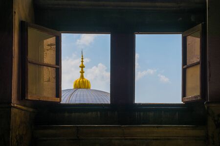 Mosque window with cityscape view and blue sky background