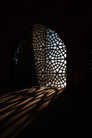 Islamic concept vertical photo. Islamic patterns on the window and shadows on the ground.