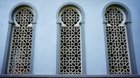 White shadow on three arched abstract pattern mosque windows on the wall. Islamic religion, Ramadan kareem, or Eid Al Fitr background