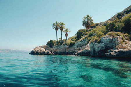 Tranquil seascape vibrant features turquoise water lapping gently against a rocky shoreline dotted with lush palm trees under a clear sky.