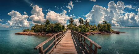 A wooden bridge leads to an island with palm trees in the turquoise sea, a panoramic view of the blue sky and white clouds, with sunlight shining on it, creating bright colors and a vibrant mood. The photography style features a wide-angle lens, a symmetrical composition, and a perspective effect, capturing the tropical beach scenery. --ar 77:30 --v 6.1 Job ID: e6050ae0-1142-4abd-a5a1-ed735887c2b4