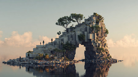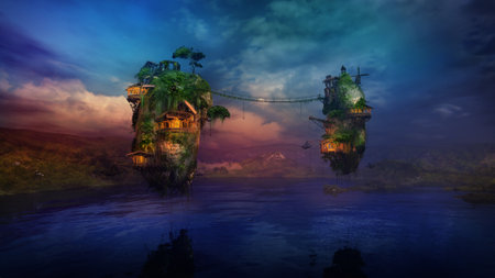 Sunlit dwellings on magical flying islands over the lake, 3D render.