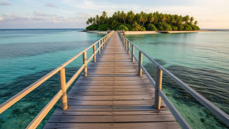 Wooden bridge leading to paradise island with turquoise water at sunset