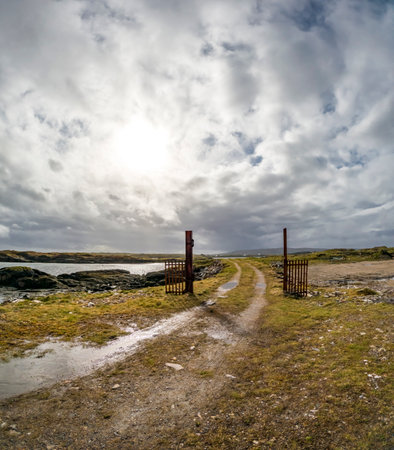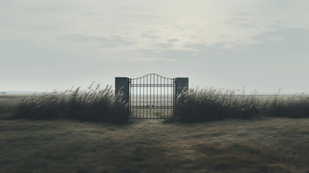 a person walks in front of a metal gate in a field, with a cloud hanging over the door. this serene seascape-style photo captures vintage aesthetics and the beauty of wildlife in a muted seascape setting. the prairiecore influence adds to the misty and unsettling atmosphere of the image. ai generated