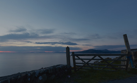 A silhouette of a farmer's gate near the sea shore in North Wales just after sunset.