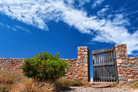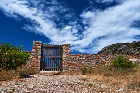 Countryside landscape. Rustic stone wall fence and aged black timber wicket door. Great blue sky with awesome clouds.