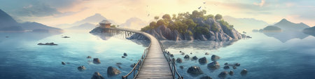 Wooden bridge over the lake in cloudy day. 3d rendering.ai generated