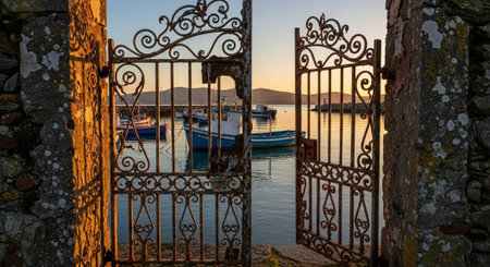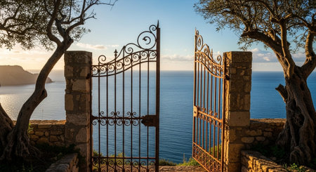 Stunning gate opening to the sea view in beach living setting of Santorini, showcasing natural beauty and serene atmosphere