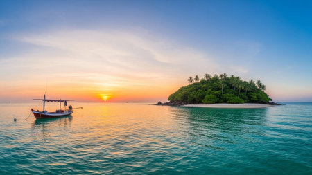 Beautiful tropical island with coconut palm tree at sunset time - Holiday Vacation concept