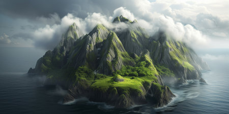 Aerial view of a volcanic island shrouded in mist and clouds, with the crater peeking through the dense foliage, a remote and mysterious paradise