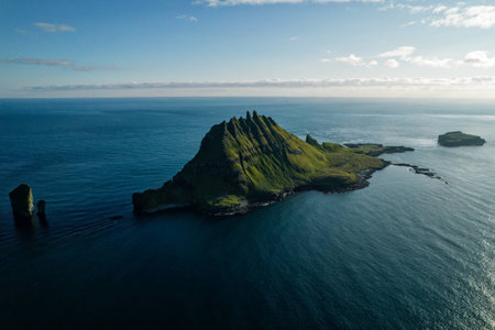 An island surrounded by clear blue water, creating a striking contrast against the vast expanse of the open sea, Aerial capture of an isolated rocky islet in a tranquil sea, AI Generated