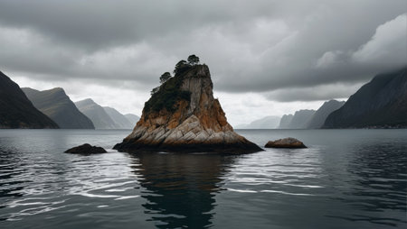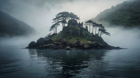 an isolated island, surrounded by water and lush trees, captured in the style of gabriel isak, nicholas roerich, and ephraim moses lilien. this 8k photograph showcases the island's serene beauty, enhanced by a soft focus lens. the image exudes a moody and atmospheric ambiance, leaving viewers in awe of its breathtaking beauty. ai generated