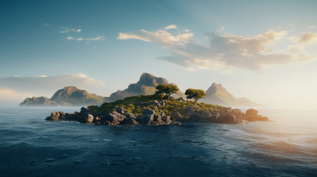 A tranquil scene showcasing an isolated island resting peacefully in calm waters beneath a clear sky, evoking feelings of serenity and simplicity in nature.