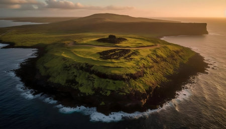 Explore a breathtaking aerial view of a lush green island surrounded by ocean waves, showcasing natural beauty and rugged cliffs under a cloudy sky.