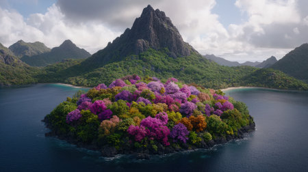 high-altitude shot of a volcanic island in the ocean, created with generative ai