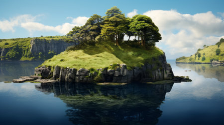 A breathtaking view of a small rocky island with lush greenery, perfectly reflecting in the tranquil waters beneath a clear sky, emphasizing peace and natural beauty.