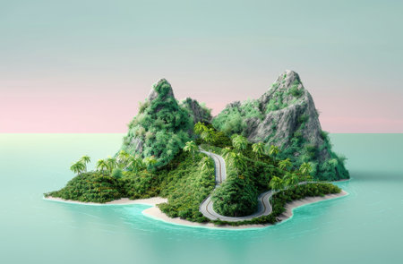 3D island with forest, road, mountains rises boldly. Natural design fits fantasy landscape art style.
