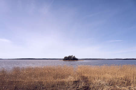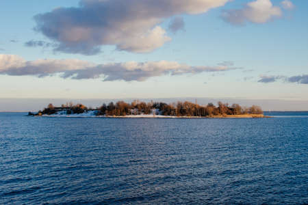 Small island in the Gulf of Finland in the setting sun and beautiful sky. Russia, Kronstadt.