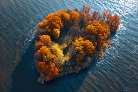 A breathtaking aerial view of a cluster of small islands surrounded by crystal clear water in the center of a serene lake, showcasing the beauty of natural landscape and marine biology AIG50